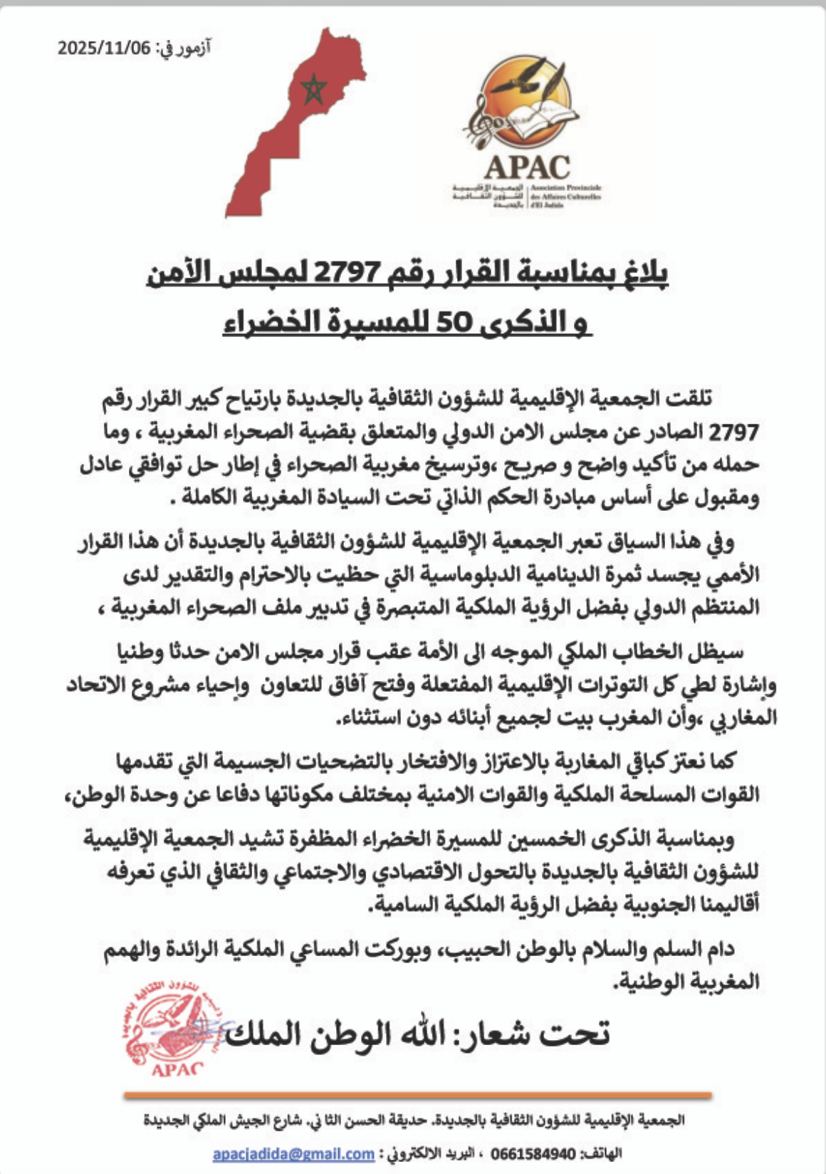وفي هذا السياق تعبر الجمعية الإقليمية للشؤون الثقافية بالجديدة أن هذا القرار الأممي يجسد ثمرة الدينامية الدبلوماسية التي حظيت بالاحترام والتقدير لدى المنتظم الدولي بفضل الرؤية الملكية المتبصرة في تدبير ملف الصحراء المغربية ،